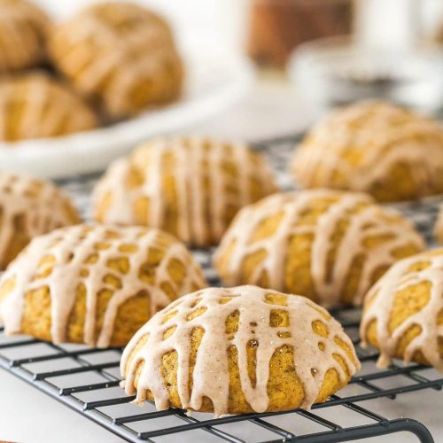 Topped with a sweet cinnamon glaze, these pumpkin cookies are soft, cakey, and bursting with pumpkin flavor. The perfect fall treat that's easy to make!