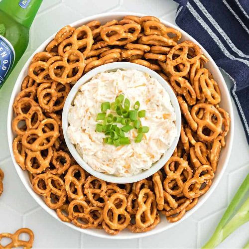 - Pour the dip into a serving bowl and top with fresh chopped scallions, if desired. Serve immediately with pretzels or chips, or chill for later.