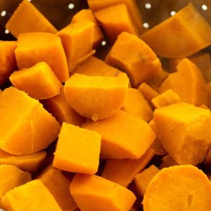 • Cut the peeled sweet potatoes into uniform 1-inch cubes.