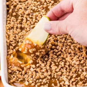 - Sprinkle the english toffee bits evenly over the caramel dip.