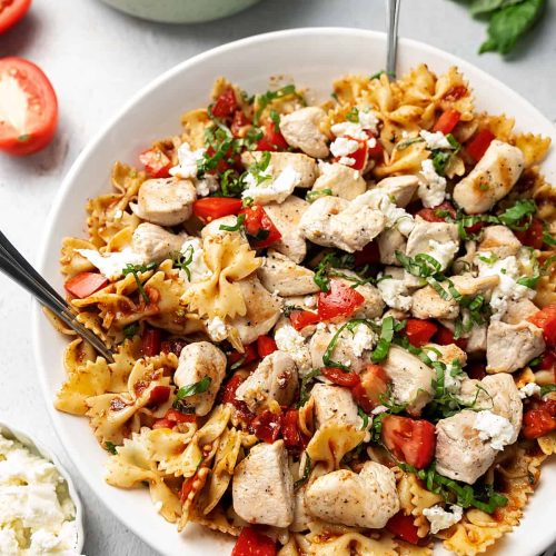 Serve the Chicken Bruschetta Pasta immediately in warm bowls. Garnish generously with freshly grated Parmesan cheese. The warmth of the pasta will slightly soften the tomatoes and release even more of their juicy goodness, and the basil will become incredibly fragrant. It’s best enjoyed fresh!