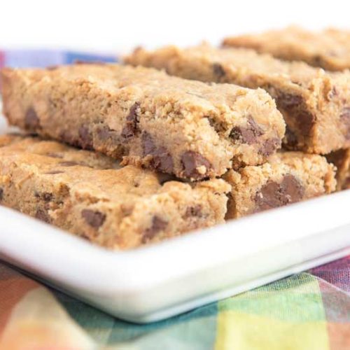 Now it’s time to bring those wet and dry ingredients together. Gradually add the dry ingredients to the wet ingredients, mixing on low speed (or stirring with a spatula) until *just* combined. Be careful not to overmix here! Overmixing develops the gluten in the flour too much, which can make your bars tough. You want to stop as soon as you no longer see streaks of flour. Fold in your chocolate chips until they’re evenly distributed throughout the dough. The dough will be thick and a little sticky.