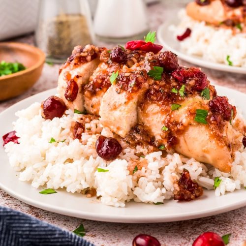 - Serve the cranberry chicken hot over cooked rice or quinoa, if desired. Garnish with fresh parsley.