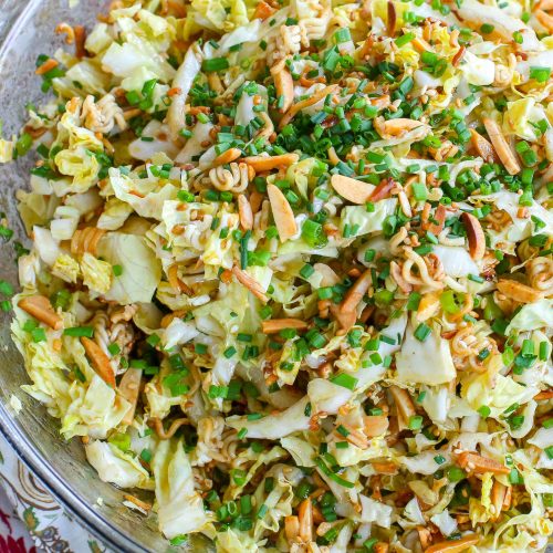 Serving & Storage: Dress the salad just before serving to keep the noodles from getting soggy. If you want it less crunchy, let it sit a few hours and the noodles absorb dressing—my husband likes it this way.