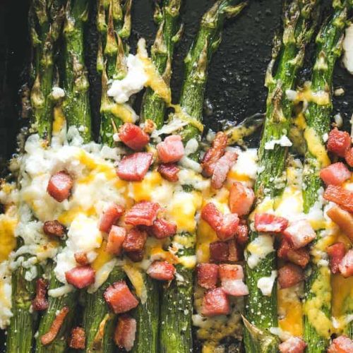 - Top asparagus with crumbled bacon and serve immediately.