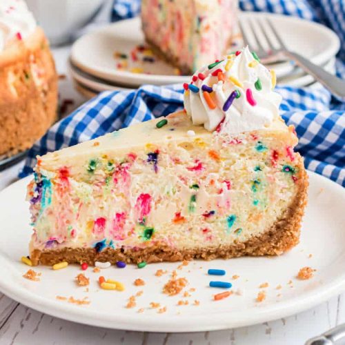 When you’re ready to serve, carefully run a thin knife around the edge of the cheesecake to loosen it from the sides of the springform pan, then release the sides of the pan. For the cleanest slices, use a sharp knife dipped in hot water and wiped dry between each cut. Serve chilled. The combination of the smooth, creamy cheesecake, the slight crunch from the crust, and the pops of color and sweetness from the sprinkles is just heavenly. Enjoy every joyful bite!