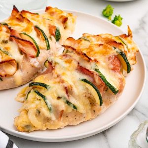 - Bake for 25 minutes or until the internal temperature of the thickest part of the chicken reaches 165°F, and the cheese is lightly browned. Allow the chicken to rest for 2-3 minutes before serving.