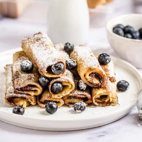 These easy French toast roll-ups are stuffed with chocolate hazelnut spread and dusted with sugar. They're a fun, sweet breakfast ready in 15 minutes!