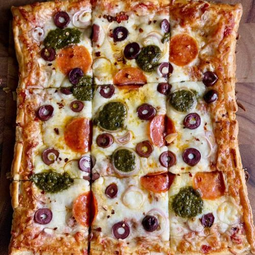 Using a sharp knife or a pizza cutter, slice your glorious puff pastry pizza into squares or wedges. Serve immediately and enjoy that incredible flaky crust!