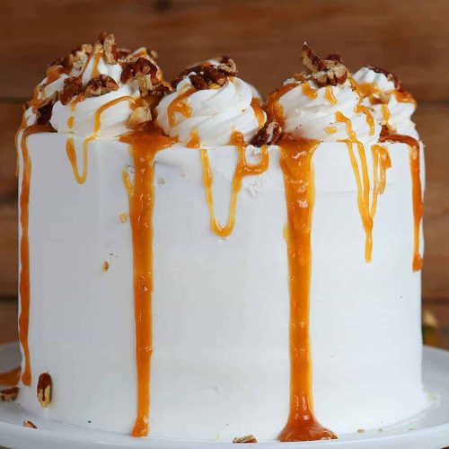 - Frost the entire cake with the remaining whipped cream, creating a smooth finish. Garnish the top with chopped pecans and a drizzle of caramel. Serve immediately or keep refrigerated until ready to serve.