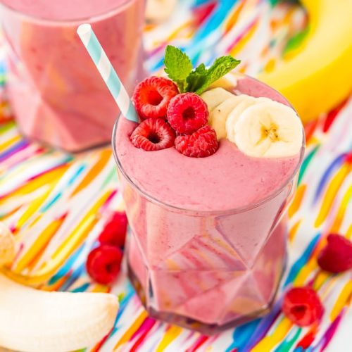Pour your beautiful raspberry banana smoothie into a glass (or two!).