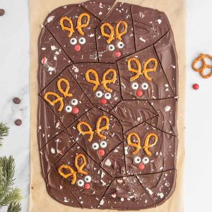 This easy Reindeer Bark recipe is a festive no-bake Christmas treat made with melted chocolate, mini pretzels for antlers, candy eyeballs, red M&M's for noses, and crushed peppermint. Perfect for holiday parties or a sweet homemade gift!