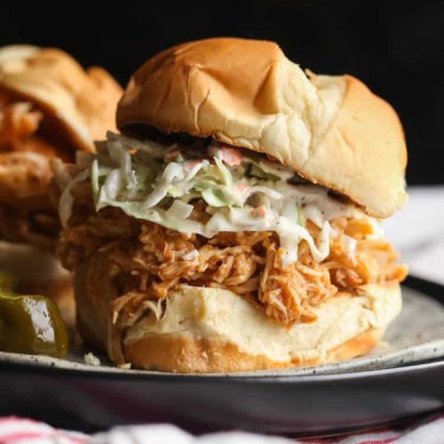 • Serve the BBQ pulled chicken warm on hamburger buns, optionally topped with coleslaw.