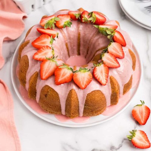 • Once the cake is completely cool, drizzle the glaze on top of the cake. Top with fresh sliced strawberries if desired.