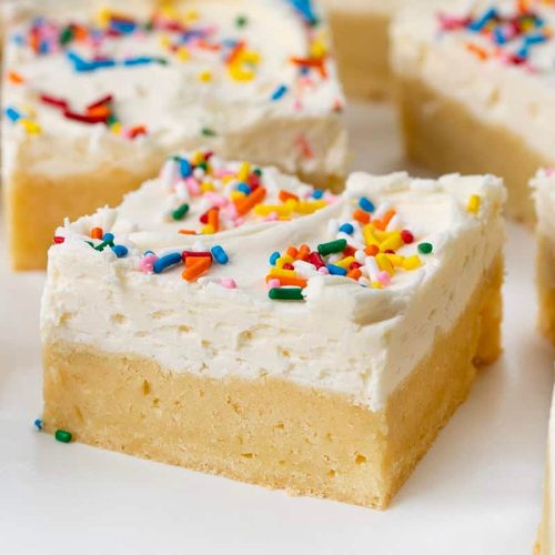 Soft, buttery sugar cookie bars topped with creamy vanilla buttercream and colorful sprinkles. Perfect for birthdays and parties!