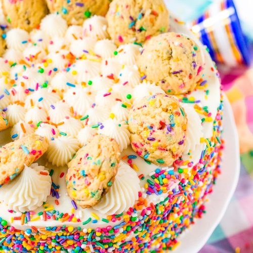 Let the cookie cake cool in the pan for about 10-15 minutes before carefully inverting it onto a wire rack to cool completely. Once it’s completely cool, it’s time for the glaze! In a medium bowl, whisk together the sifted powdered sugar, milk (starting with ⅓ cup), and vanilla extract. Add more milk, a teaspoon at a time, until you reach a pourable but thick consistency. Drizzle or spread the glaze over the cooled cookie cake. If you want to add sprinkles, do it immediately after glazing while it’s still wet!