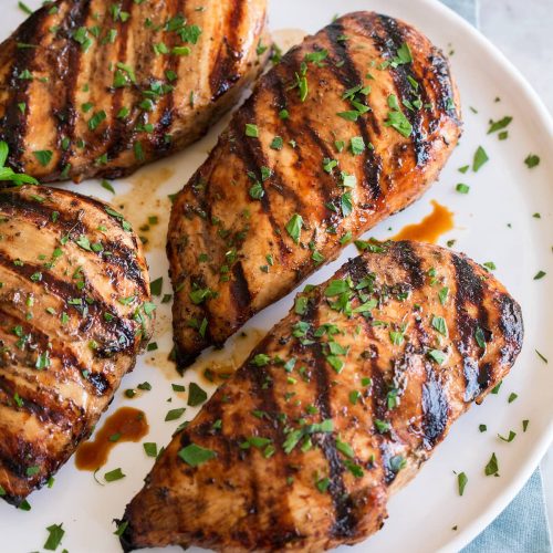 Robustly flavored balsamic chicken marinated with garlic, fresh herbs, and tangy balsamic vinegar, then grilled to perfection for a tender and juicy meal.