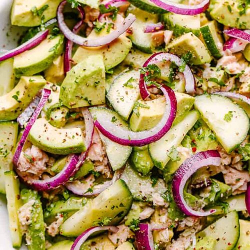 This tuna salad recipe is a delicious twist on a classic favorite, featuring flaky tuna combined with creamy avocado, fresh cucumbers, and sharp red onions.