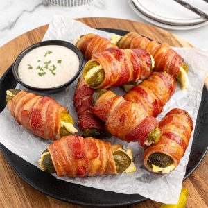 Bake for 25-30 minutes, or until golden brown. (Please remember that all ovens cook differently, so begin checking on the bacon wrapped pickles at the 22 minute mark) Remove from the oven and serve with your choice of dipping sauce.