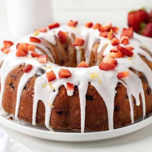 • After glazing the cake, sprinkle with lemon zest and scatter the chopped strawberries on top. Let the glaze set before serving.